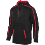100% polyester tonal performance wicking fleece * 100% polyester performance wicking fleece solid contrast inserts and pocket welts * Contrast color lightweight mesh hood lining * Wicks moisture away from the body * Heathered tipped drawcord in Adult sizes only * Pad print label * Raglan sleeves with self-fabric cuffs * Front pocket with kangaroo pocket * Double-needle open bottom.