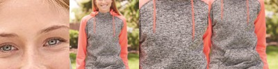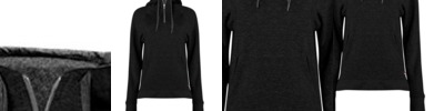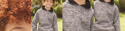 - Solid fleece body with charcoal fleck hood, drawcord and sleeves