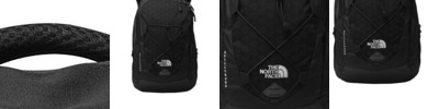 Mid Grey/Asphalt Grey, Monster Blue/Asphalt Grey: 600D recycled polyester, 1200D recycled polyester Rainyday Ivory Dark Heather/TNF Black, TNF Dark Grey Heather/Cardinal Red: 300D recycled heather polyester, 1200D recycled polyester TNF Black: 600D recycled polyester, 600D geo emboss recycled polyester, 1200D recycled polyester FlexVent ™ suspension system Floating padded laptop sleeve in main compartment Front elastic bungee for exterior storage Two mesh water bottle pockets Comfortable, padded top haul handle Sternum strap with whistle buckle Contrast embroidered The North Face logo on front Average weight: 2 lbs. 0.1 oz. (910 g) Volume: 1769 inÿ¿ÿ³ (29 liters) Laptop sleeve: 12'h x 14'd Dimensions: 19.75'h x 13.25'w x 7.5'd Note: Bags not intended for use by children 12 and under.