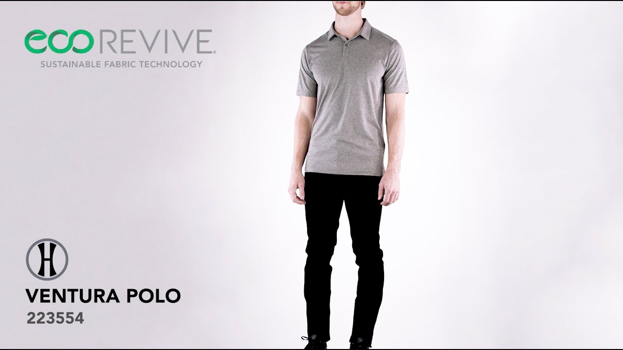* Ventura Lightweight Suede knit 4.87-ounce * Solids, 89% recycled polyester/11% spandex * Heathers, 45% recycled polyester/44% polyester/11% spandex * Wicks moisture * Tag-free label * Self-fabric collar with collar stay that helps maintain collar shape wash after wash * Mesh collar stand * Box-stitched placket * Two-button placket * Set-in sleeves with rolled forward shoulder seam * Side vents