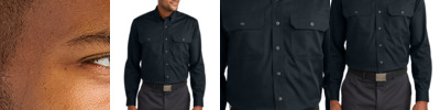 Built from durable ripstop, this rugged shirt looks professional and performs with grit throughout any tough job. 5-ounce, 60/40 polyester/cotton ripstop Stain release Reinforced triple-needle stitching Button-down collar Dyed-to-match buttons Double button-through chest pockets Left pocket pen slot Back pleats Rounded adjustable cuffs Rental-friendly