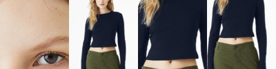 Stretch fit Crewneck binding 3/4-sleeve 1x1 micro rib Side seamed Mid-length Tear-away label 5.4-ounce, 52/48 Airlume combed and ring spun cotton/polyester, 32 singles Athletic Heather/Black: 90/10 Airlume combed and ring spun cotton/polyester