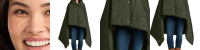Is it a poncho or a blanket? It's both! This versatile, packable poncho blanket is water-resistant and ready for adventures-both indoors and out. 100% polyester ripstop with durable water-repellent (DWR) finish 4.7-ounce, 100% polyester fill Detachable, zippered hood with visor Eddie Bauer logo snaps at hood and collar Elastic hand straps Attached, toggled cinch sack with contrast heat transfer Eddie Bauer logo Embroidery access pocket Woven Eddie Bauer logo patch label on lower right blanket corner Dimensions (excluding hood): 50' x 70'